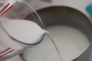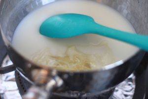 杏仁浆倒入小锅,放糖,放入吉利丁片,小火加热到吉利丁片融化。如果是琼脂,需要煮久一点,大概是要到假沸状态。