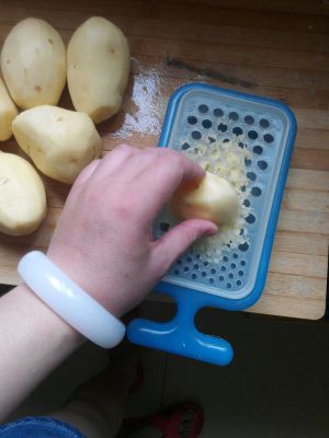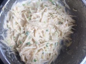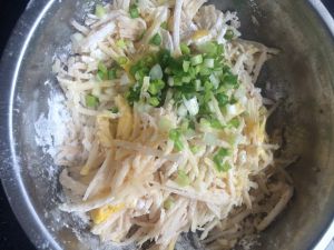 土豆切成土豆丝 或者刷成土豆丝 放适量面粉 打个鸡蛋 加点水 放入盐 鸡精 味精 根据个人口味调味 我用的是最简单的