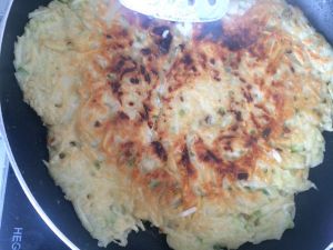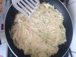 入锅后将一面煎到焦黄为止 才能定型 翻另一面 特别建议煎薄一点 我放的两个小土豆一下子全进去了 煎的很厚啊!不太好熟 中间还容易焦 宁可多煎几次不要偷懒哦