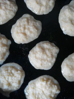 5.开始煎饼:平底锅刷一层薄油,开最小火,用裱花袋将蛋白面糊挤入平底锅中 *面糊的体积要比土豆泥饼稍大一些