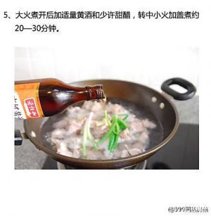 入八角香叶,加糖至甜度适宜,大火5min改小火45min,不宜过烂,骨肉不分离为妙。