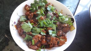 下油放姜片,排骨下锅放老抽炒至偏黄,下糖醋番茄酱,加水燜15分钟左右收汁,最后撒上香菜葱花