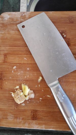 排骨切小段,冷水下锅,沸前出锅冲凉,香料泡水,葱姜切段,片。