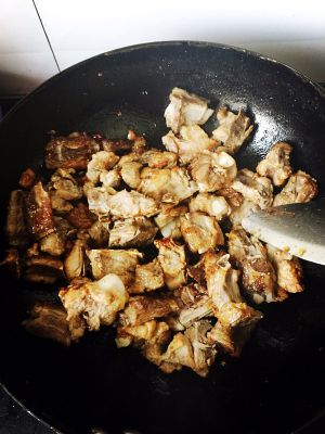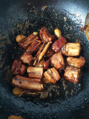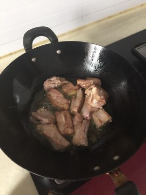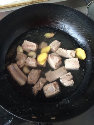 锅中加入适量油,放入生姜片、葱段微微炒香,加入排骨煸炒至金黄。 可加入少许冰糖炒出糖色。