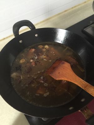 锅中加入花雕酒'冰糖'盐'红曲米'清水'大火烧制5分钟'转中火盖盖'顿制20分钟左右'注意到最后别糊锅'