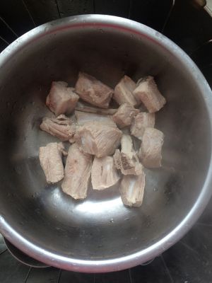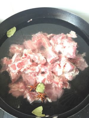 排骨用凉水洗上2遍后,放入提前烧开的热水锅中,锅中加入2片香叶,2片生姜,2颗八角,1小勺盐,大火把排骨煮开后撇去浮沫再煮10分钟捞出排骨。再把锅中重新加开水,把排骨倒入再煮5分钟,撇出浮沫煮上2分钟左右捞出排骨备用。