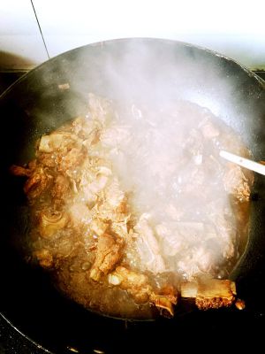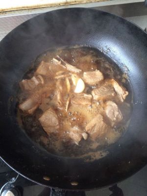 加入料酒、生抽、糖、醋、清水(即将没过但不要没过排骨),盖盖小火慢炖30-40分钟,转中火炖10-20分钟,大火收汁。