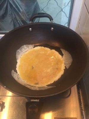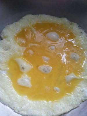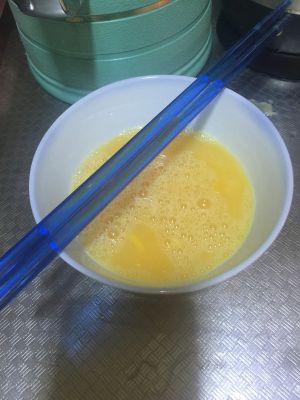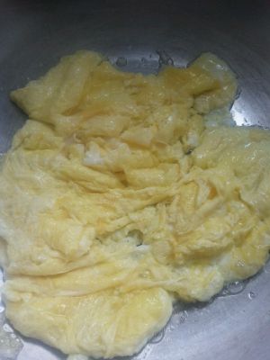锅热油,关小火,这时将蛋液下锅,迅速翻炒,关火。