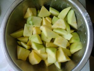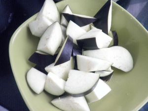 将茄子滚刀切,用盐腌渍,把水分沥出