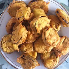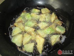 把裹好面的茄子放在油锅里炸,两分钟后捞出。