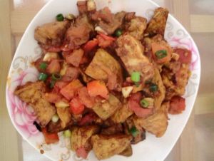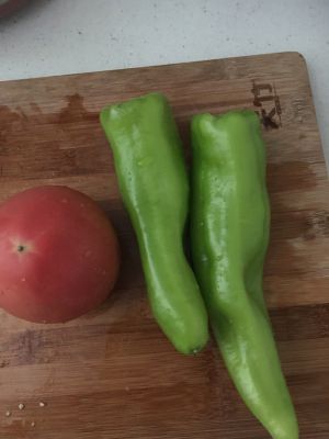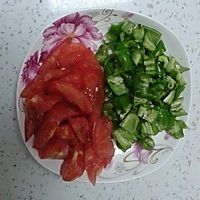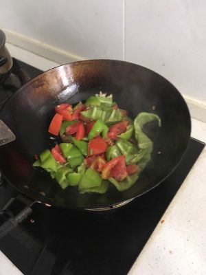 将番茄和青椒放锅中翻炒至番茄的汁液全部出来。放入炸好的茄子。