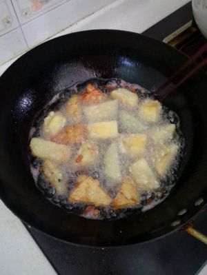 凉锅热油炸茄子,油稍微多一点,待茄子呈金黄色边缘稍焦后出锅