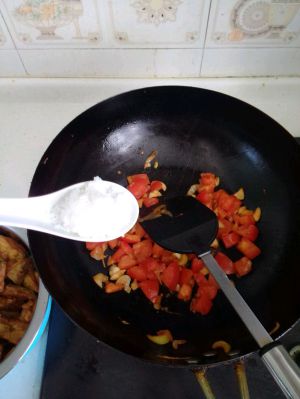 锅中留油爆炒葱蒜西红柿,喜欢吃甜的加一勺白糖,翻炒出西红柿汁后加入炸好的茄子