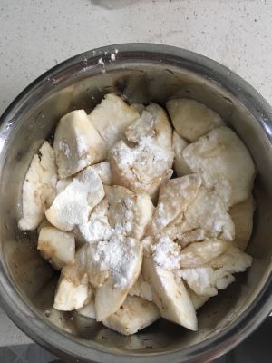 茄子把水沥出后加入玉米淀粉抓匀腌制