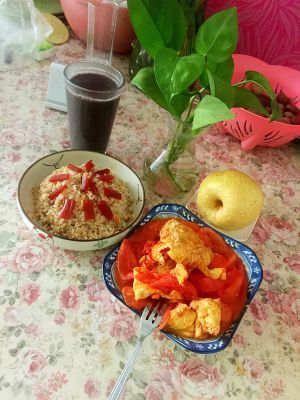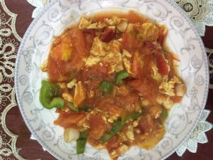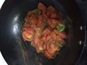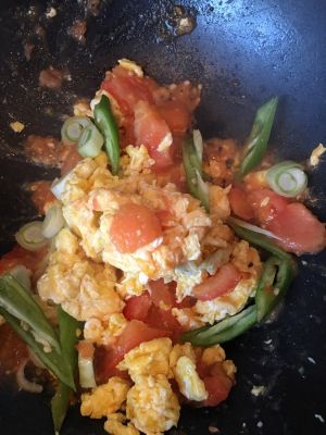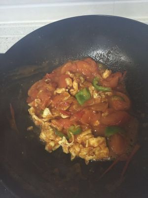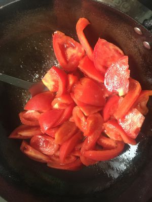 在炒完鸡蛋的锅中再倒少许油,放入西红柿,炒的过程可以用炒勺压一压西红柿,让它尽快变软。男神还背着我偷偷扔了几个青椒进去,不过味道还不错~