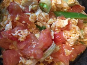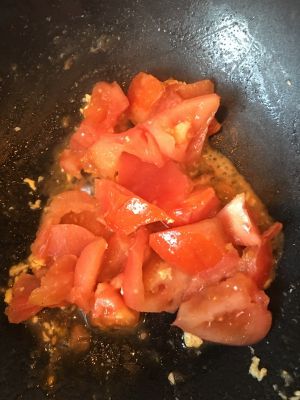 鸡蛋盛出,锅内放油快速倒入西红柿炒拌均匀……