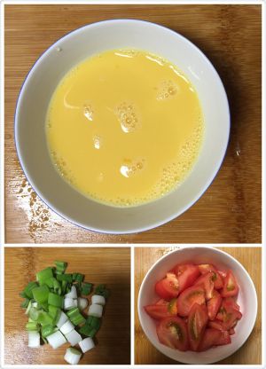 将西红柿切块,鸡蛋和葱花放在一起搅拌均匀。