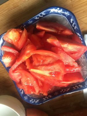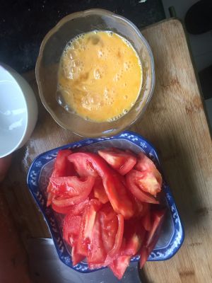 切少许葱,图里的葱还有别的菜要用,所以多一些。西红柿切块。鸡蛋提前打在碗里搅拌,并且一定要搅拌到位,要有速度时间还不能短,这样一个鸡蛋能炒出两个鸡蛋的感觉。