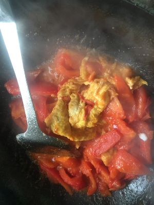 西红柿炒的差不多了放入刚才炒好的鸡蛋,一起翻炒。这时候放点盐,一点点糖。西红柿炒一炒皮会掉下来,如果不想要皮的话可以在切之前,把西红柿放在热水里泡一下,皮就可以撕下来。