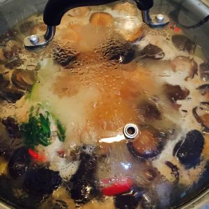 鸡块炒变色,加料酒,开水,泡蘑菇的水,没过鸡块