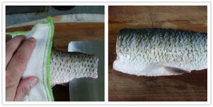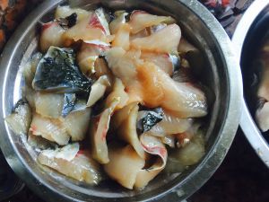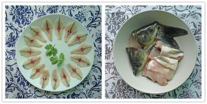 鱼肉切蝴蝶片,鱼头、鱼骨剁成块。