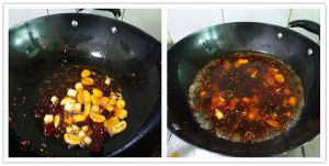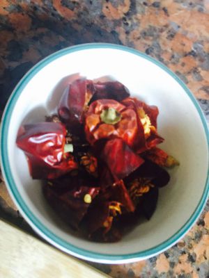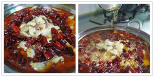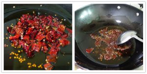 热锅放入菜籽油,烧至5成热时下干辣椒段过油15秒捞起。余油下豆瓣炒香。