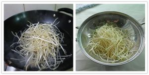 豆芽掐头去尾,锅中烧开水,豆芽汆水捞出,放入盛具中,加少许盐拌匀。