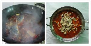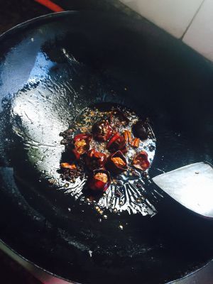 先炒辣椒、八角、桂皮,加入鱼骨炒香
