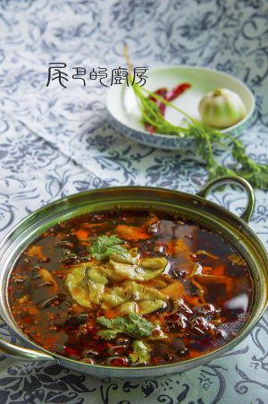 下姜葱蒜、花椒、辣椒粉,加鲜汤,放料酒,胡椒粉、白糖、盐煮开。