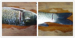 草鱼1条约1000g,去鳞鳃、内脏后洗净,在头尾处分别割一刀。