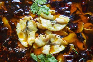 将花椒、干辣椒段铺在鱼片上,热锅放入菜籽油,烧至10成热,将油淋在花椒干辣椒上即可。
