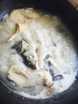 加入温水或开水,让鱼汤熬成奶白色,后将鱼骨捞入配菜中。