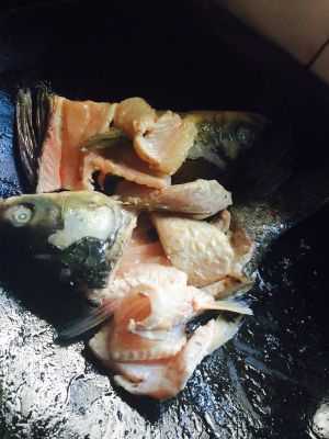 姜切片,蒜切成蓉,香葱葱白部切段备用,香菜用手折成小段,把鱼骨和鱼头放进锅里加水……后面秘笈不透露