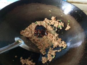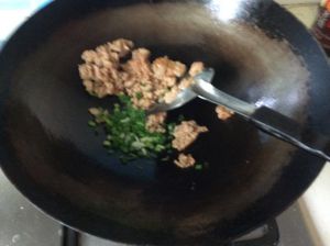 锅内放油,放入肉末,葱姜料酒翻炒肉末变色。