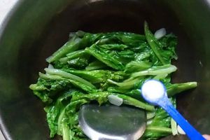 倒入生菜炒软至变深绿色,加入少许盐调味