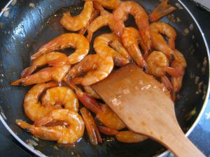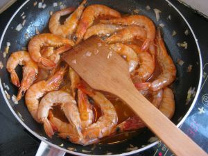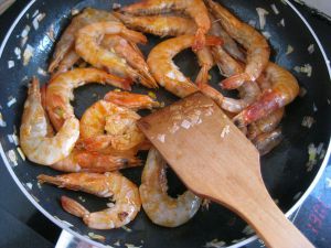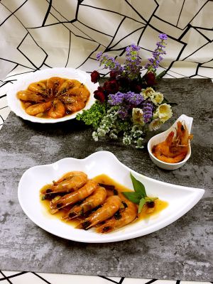 然后小火煮,当锅里汤汁开始变稠、虾基本熟透的时候加少量盐调味,盖上锅盖焖30秒之后即可出锅。