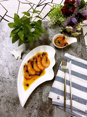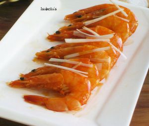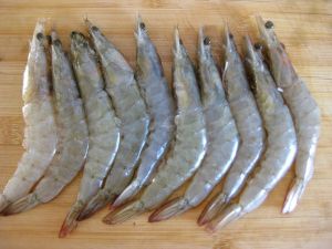 大虾剪去虾须、虾脚和虾枪,用牙签从虾背的关节处挑出虾线,再用牙签从剪去虾枪时留下的洞里挑出沙袋。然后把虾表面的水用厨房纸擦拭干净。