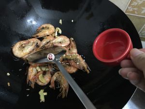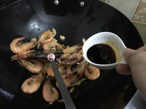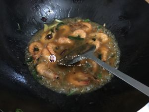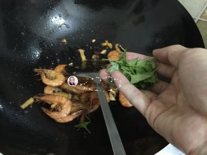 放虾放盐放料酒,翻炒,加少量水焖,最后要留点汁出锅