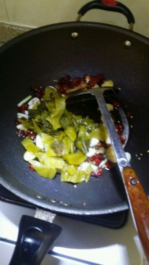 放油下花椒稍炸后切碎待用,下葱,姜,蒜,干椒翻炒后加洗净的酸菜炒香。