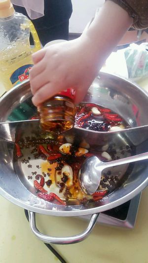把花椒,干辣椒,蒜头等下油锅煸出香味,倒入适量老干妈