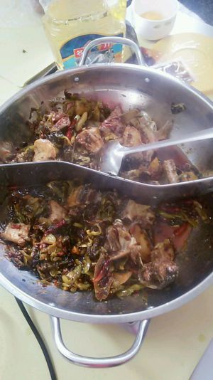 锅里放入少许油,待油烧热后加入鱼骨和切好的葱、蒜、姜、干辣椒以及酸菜翻炒