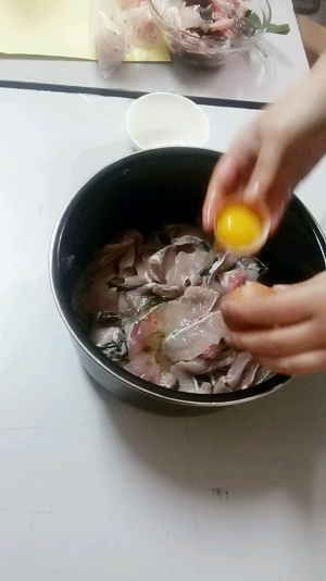 鱼肉片里面加入适量盐➕2勺淀粉➕适量胡椒粉➕一个蛋清➕1勺料酒、拌匀后腌制半小时待用。
