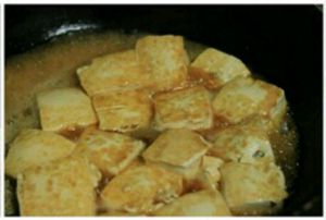 锅内剩油加水,放入盐,鸡精,大火烧开后慢慢放入煎好的豆腐,收汤汁!