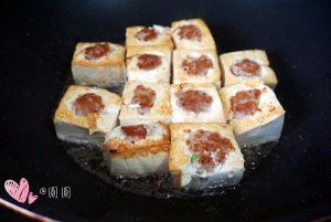 热锅热油,将豆腐酿放入油锅,中小火煎至一面金黄