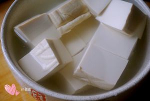 豆腐切小块,放入盐水中浸泡15分钟
