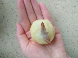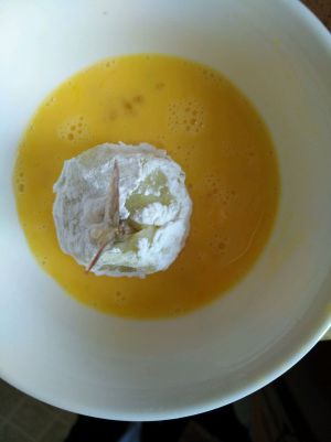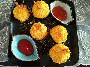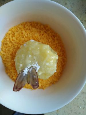 用勺子挖起一点土豆泥捏成小饼状,把虾放入中间包起来即可。