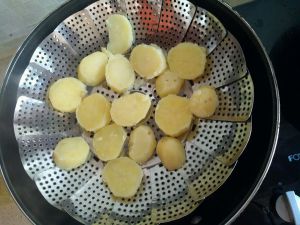 土豆削皮切片上锅整熟。把虾洗净开背去壳,用盐胡椒粉腌制。