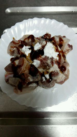 步骤:1 冷排一条洗净切块,加入少许蚝油,生粉,酱油腌10分钟备用!