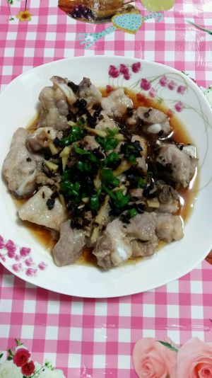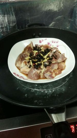 步骤:2 把腌好的排骨放入碟内,面上加入切好的姜丝,豆豉!烧滚水放入备用好的排骨下去蒸10分钟关火!