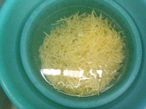 土豆丝放水里洗掉淀粉,洗清。